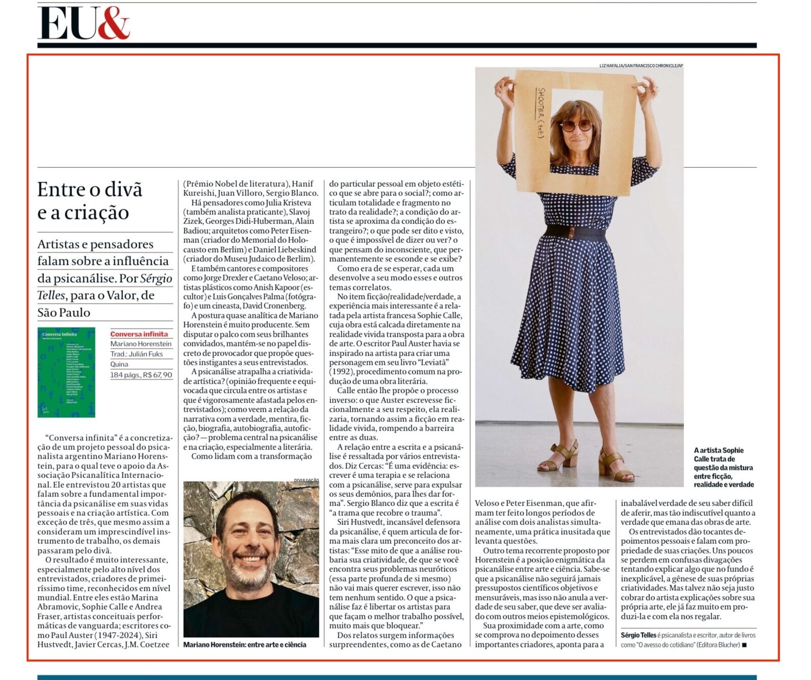 Em artigo publicada no Valor Econômico, o psicanalista e crítico Sérgio Telles destaca Conversa infinita, de Mariano Horenstein, como uma obra relevante sobre a interlocução entre psicanálise e criação artística. Telles ressalta a “clareza e elegância” do livro ao tratar de temas como transferência, escuta e linguagem, dimensões centrais tanto para a clínica quanto para a produção artística contemporânea.